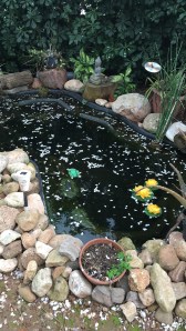 Debajo del almendro el pequeño estanque estaba totalmente cubierto de pétalos de flores que habían caído en el durante la noche gracias a la lluvia y el viento, solo el arrullo de la fuente cayendo en el estanque se abría camino entre los pétalos dándoles movimiento encima del agua. Debajo las carpas escondidas durante todo el invierno habían salido dando color al agua y estaban jugando alegres, recorriendo una y otra vez el estanque intuyendo ya la primavera y el renacer de la vida .